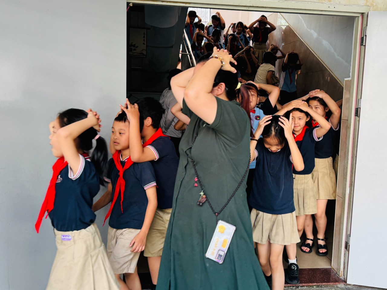 • 一樓及平房班級(jí):正在戶外或教室的師生遵循 "先撤離后避險(xiǎn)" 原則,在任課教師帶領(lǐng)下,雙手護(hù)頭沿最近安全通道低姿快跑至操場(chǎng)應(yīng)急集結(jié)點(diǎn);