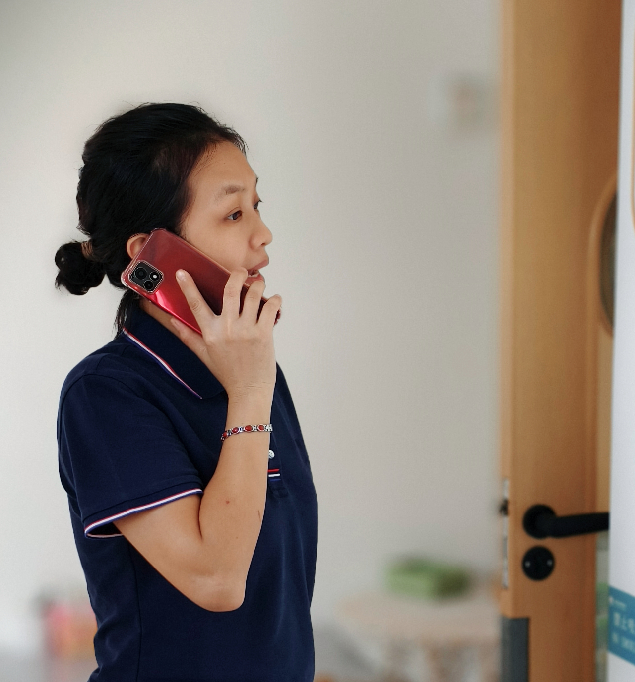 ? 班主任上前詢問幼兒用餐以及身體狀況,接著班主任打電話給家長了解幼兒這兩天的身體狀況。