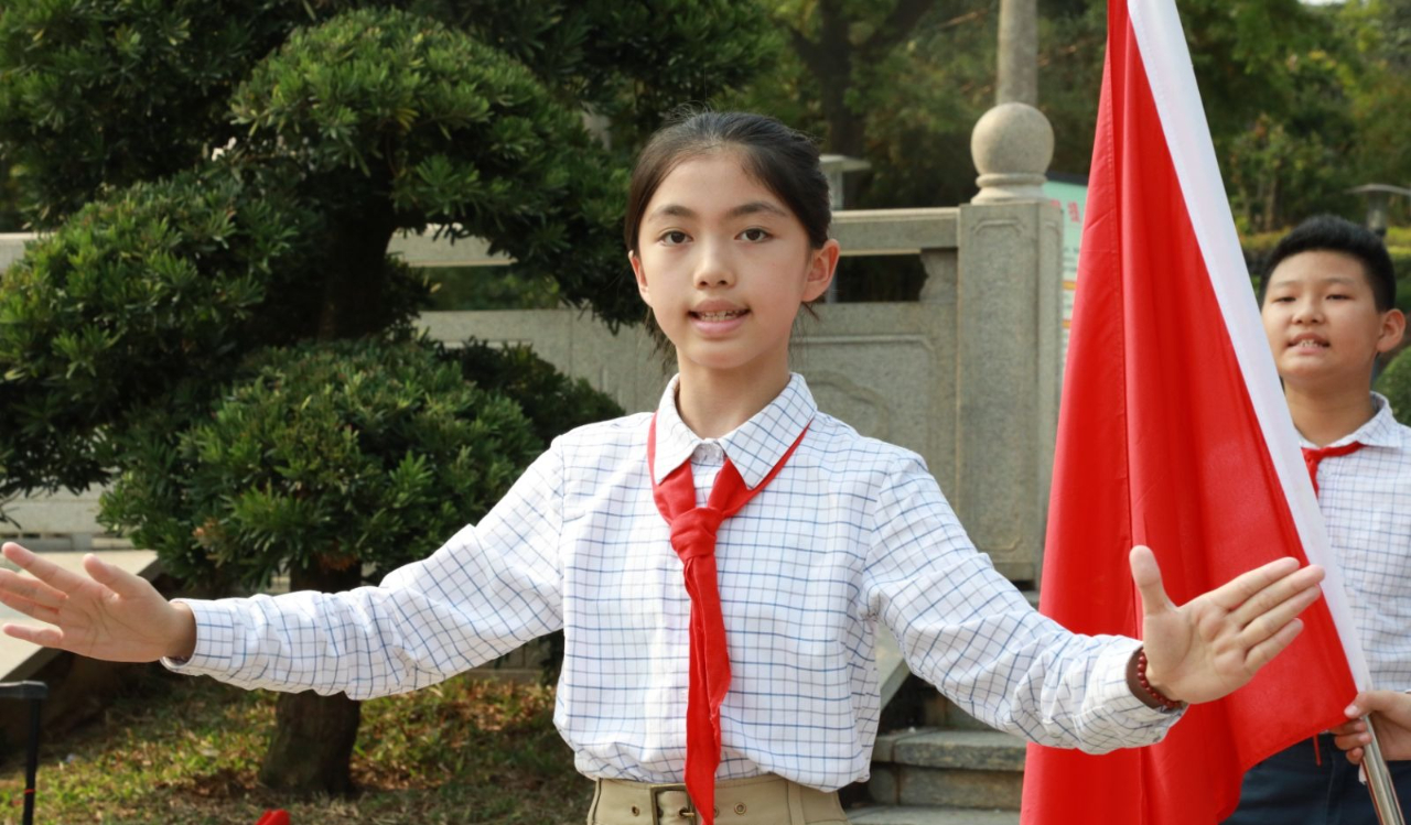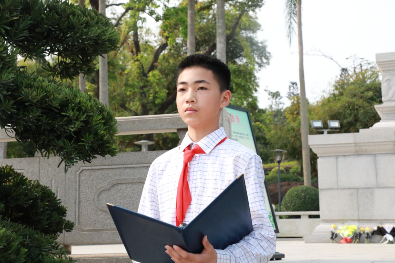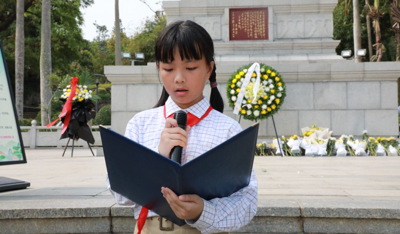 四(5)班吳優(yōu)同學作為少先隊員代表發(fā)言,借緬懷先烈事跡,強調(diào)其對當下幸福生活的貢獻,呼吁新時代少年珍視優(yōu)越條件,以先烈精神為指引,砥礪自身,勇?lián)鷷r代使命,表達了對先烈的緬懷及傳承紅色基因、助力民族復興的決心 。