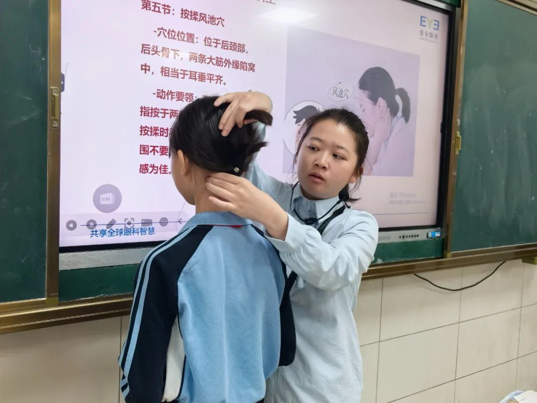 在愛眼知識(shí)進(jìn)課堂活動(dòng)中,老師走進(jìn)教室,專注講解正確的眼保健操姿勢。老師詳細(xì)介紹各穴位位置,如講解揉天應(yīng)穴時(shí),示范雙手大拇指按在左右眉頭下上眶角處,其余四指呈弓狀支于前額。接著,針對擠按睛明穴、揉四白穴等動(dòng)作,老師邊講邊做,讓同學(xué)們看清每個(gè)動(dòng)作要領(lǐng)。